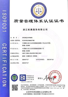 浙江歐騰服飾有限公司位于世界小商品之都-義烏。創立于2015年,是一家專業生產無縫針織運動服飾和內衣的工貿一體企業,擁有自主出口權。 工廠的占地面積約16000平方米 ,引進了大型圣東尼、高騰等多種先進的制衣設備300余臺。月產能可達90萬件。 歐騰服飾每年投入近百萬資金打樣開發新產品,有著一支高素質設計、技術員工隊伍。工廠先后通過了ISO 9001質量管理體系認證、BSCI認證、GRS認證、OEKO-TEX國際生態紡織品認證等多項專利檢測報告??商峁㎡EM&ODM服務。歐騰服飾以一套完整、科學的質量管理體系,生產的服裝從原材料紗線到成衣,質量完全能夠滿足國內、國際質量要求。獲得了客戶一致好評。工廠先后獲得省科技型企業、國家高新企業、義烏市誠信講信用單位、規上企業、信用AAA級等榮譽。